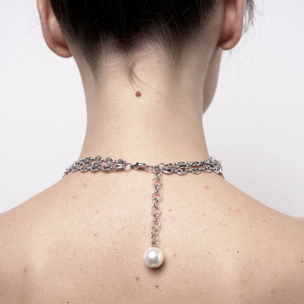 Antique silver-plated necklace featuring marine knots arranged in three elegant layers.