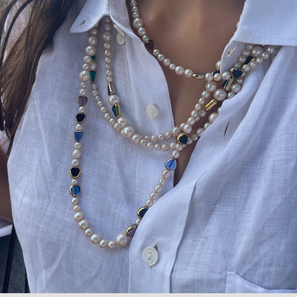 Vintage colored glass heart charms set on four rows of vintage glass pearls in varying sizes. Featuring a double hook closure, this versatile piece can also be worn on pants for a unique styling option.