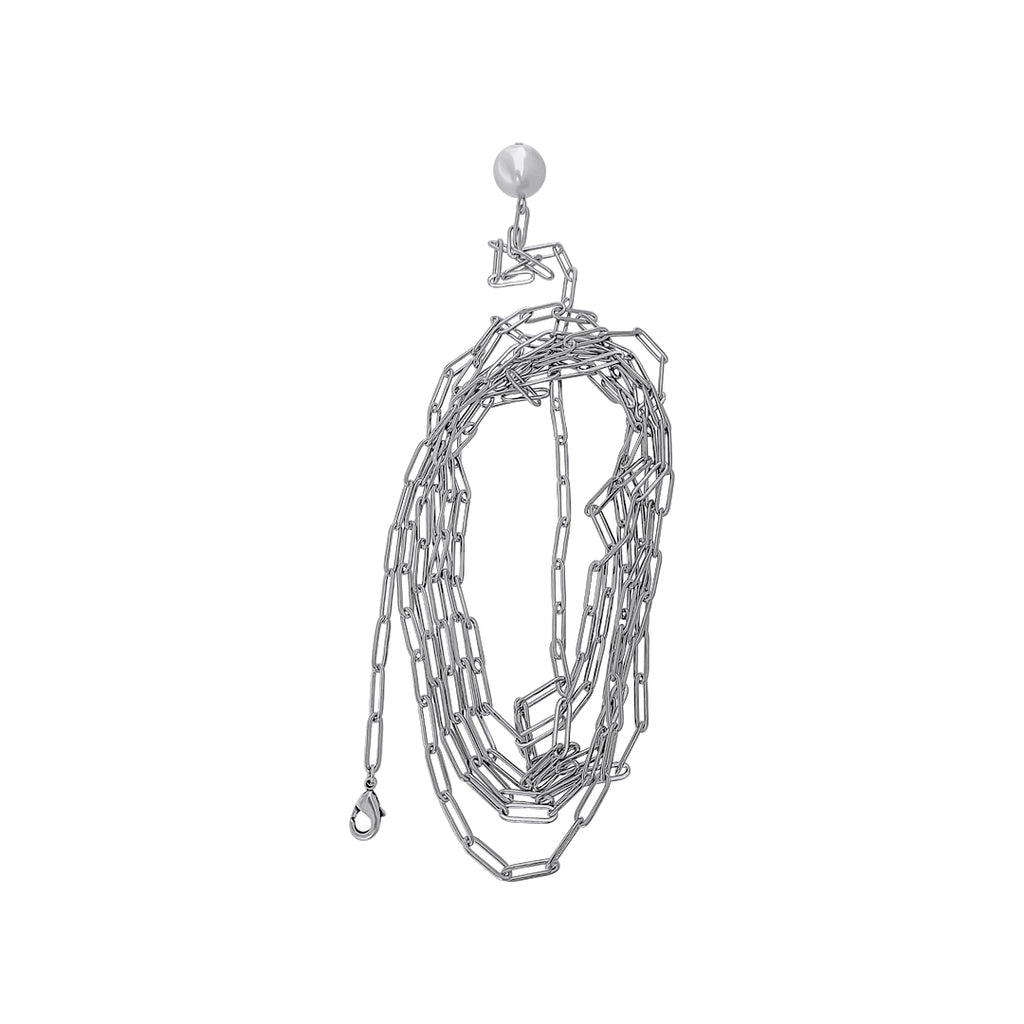 Silver colored brass 2 meters chain with a glass pearl tide to the end. This can be worn wrapped or rolled, anywhere around your body.