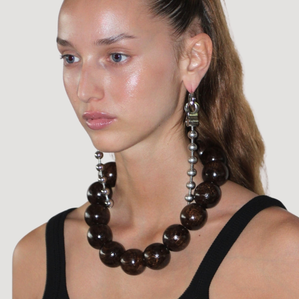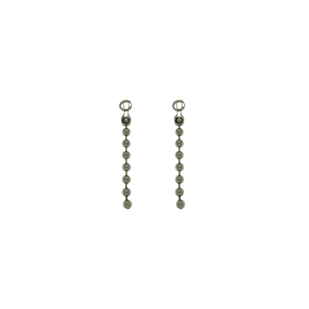 Tightly connected silver-plated brass spheres and finished with a hook closure. Measuring approximately 13 cm in length, they create a bold vertical line while remaining lightweight and wearable.