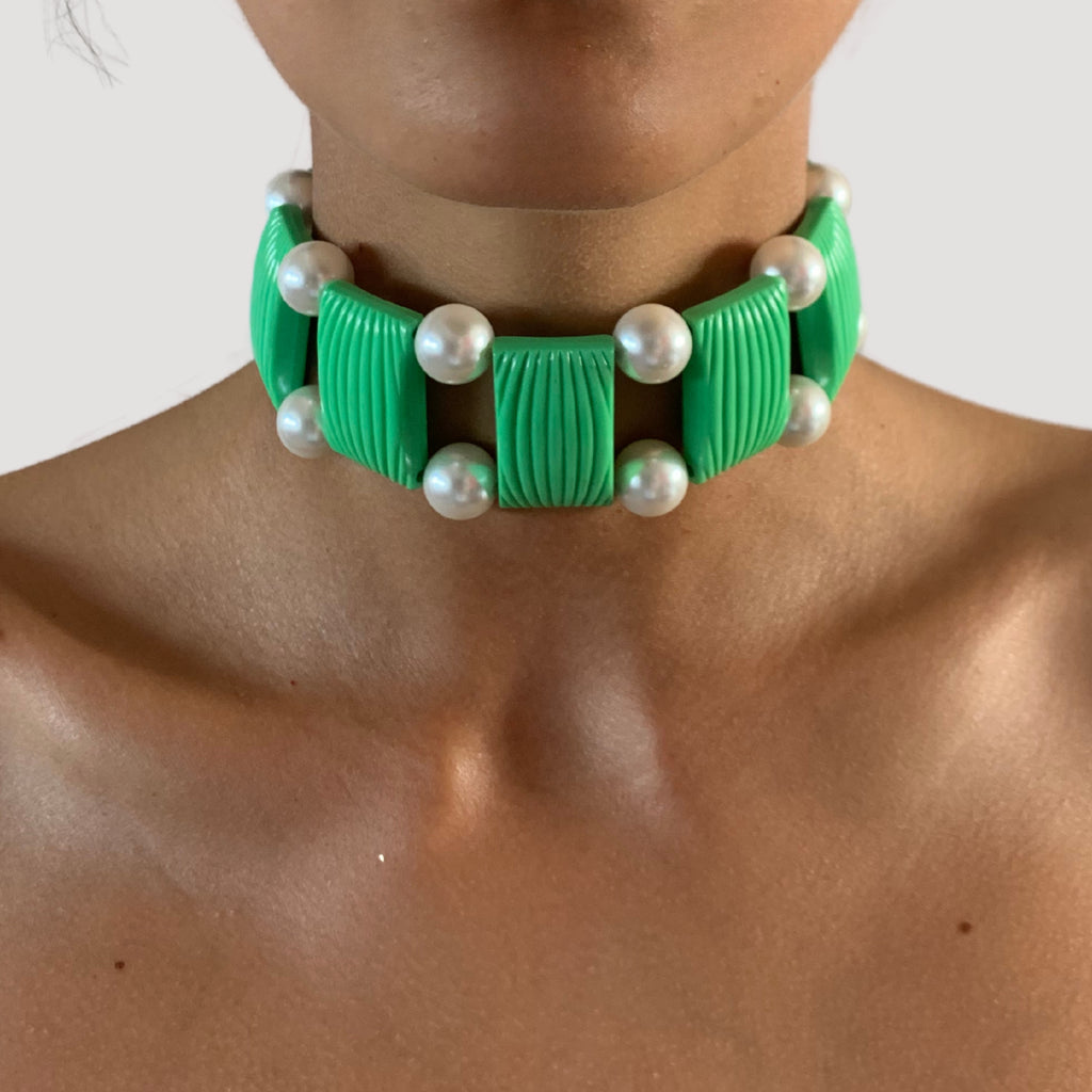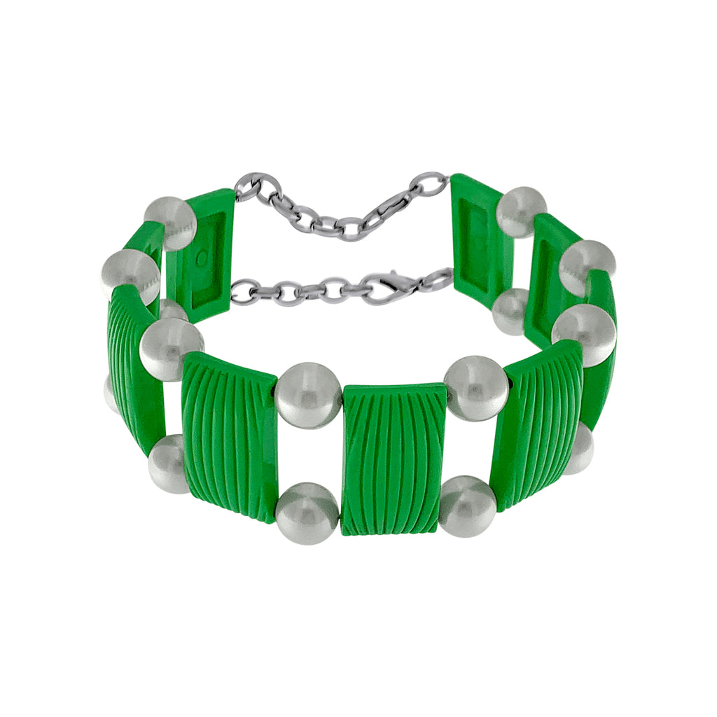 Double silver-colored clasps attached to vintage rectangular plastic charms and glass pearl ornaments. All hand-mounted. Available in three different colors.