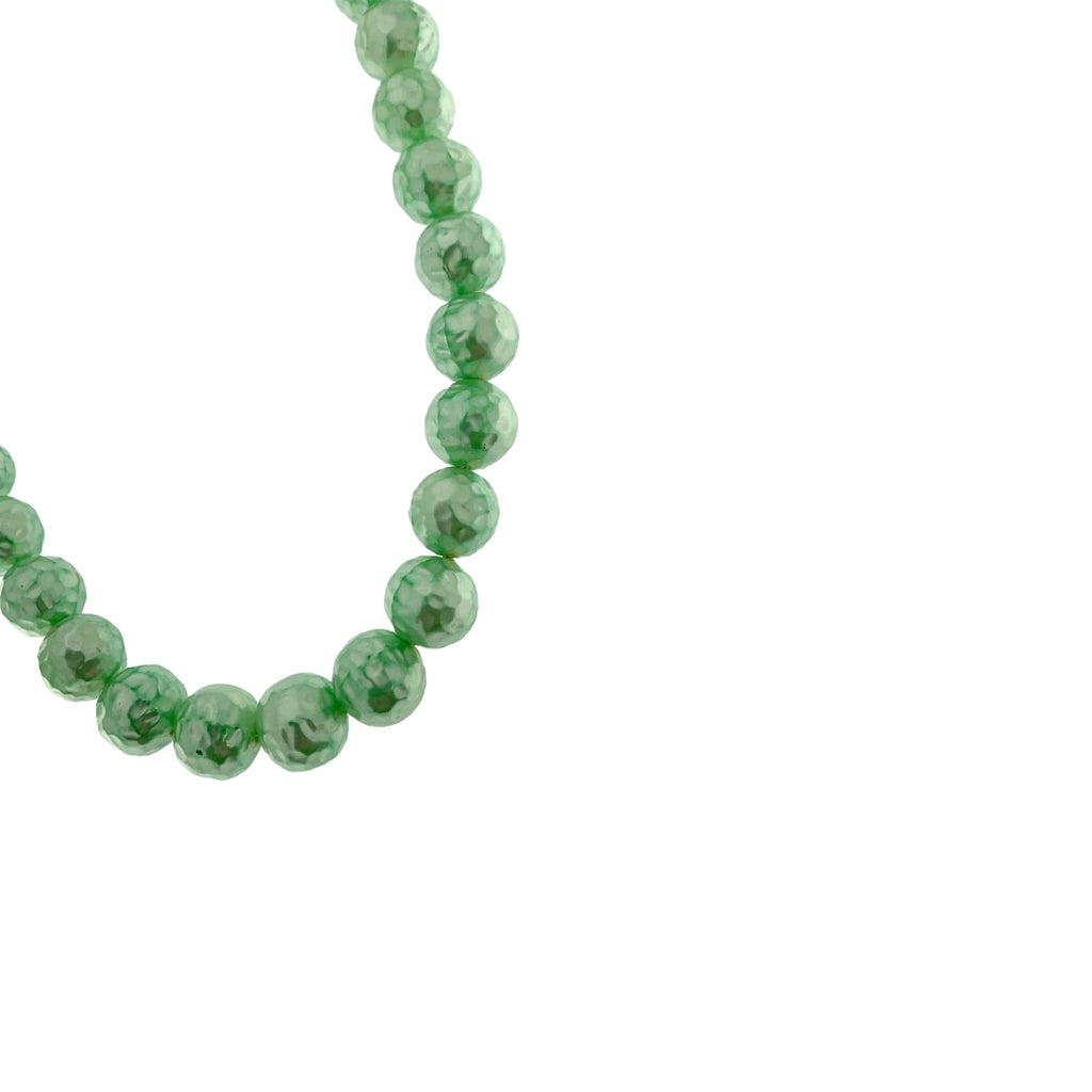 Plastic hammered vintage necklace composed of beads in a fresh mint green tone with subtle swirls. The spherical beads have a rock-like hardness and glossy finish.