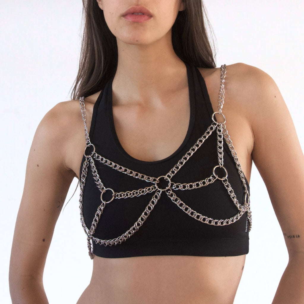 100% Made in Italy and meticulously hand-constructed through an intricate, chain-by-chain hand process. Every single link is individually hand-mounted onto brass round jump rings, resulting in a piece that is as unique as it is refined. The chains, crafted in iron and steel, are finished with a luminous silver color plating for a striking modern effect.